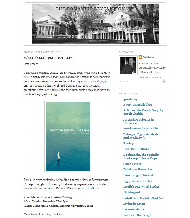 The Romantic Revolutionary was where Mostafa started writing online. It is the blog that contains most of his essays and opinion pieces. Mostafa was most active on this blog from 2008 until 2016.